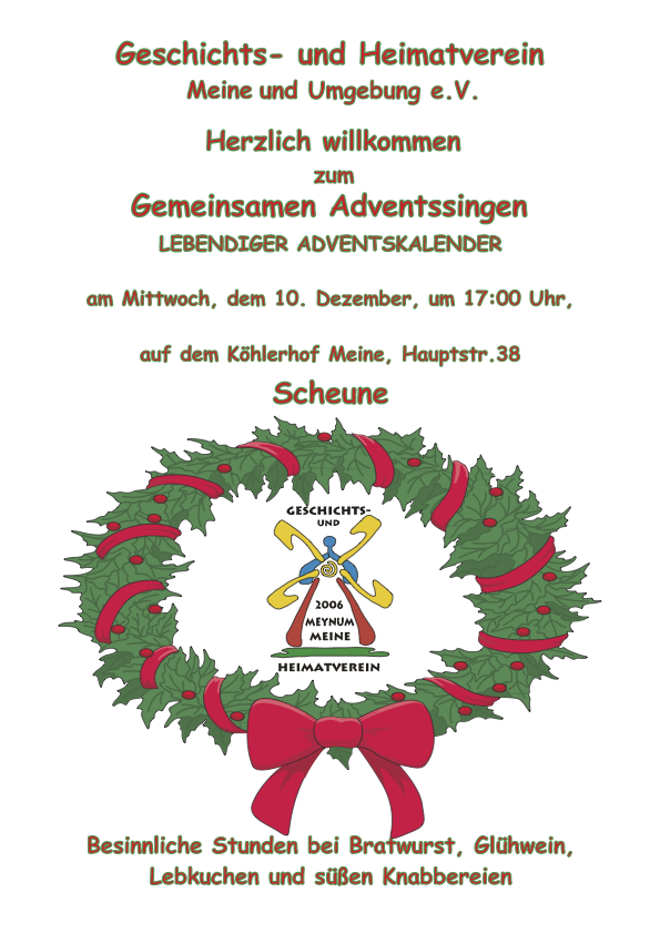 Der Vorstand des Geschichts- und Heimatvereins Meine und Umgebung e.V. wünscht Ihnen eine besinnliche Adventszeit. Wir freuen uns auf Ihren Besuch!